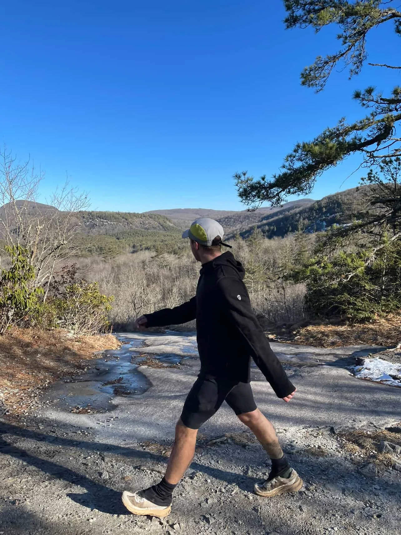 A wind advisory was placed in effect for the region out of concern that trees would be blown down from their shallow, granite-grasping root clusters. From the hours of 5:00AM to 8:00AM, I found not one single second that allowed me to ignore this fact. While running along the Blackrock Ridge, I was constantly battered by gusts that climbed up both sides of the mountain and shoved me side to side. Snowfall the likes I hadn’t seen since I was a child blanketed the landscape a week prior, and what remained were inches of sheet ice which stood in place of what I remember to be softpack dirt. Every mile and every step was exhilarating, and not for any genuine sense of danger, but because the landscapes of the American so rarely threw together a combination of factors such as these, and I knew I was blessed to be equipped to enjoy the day.