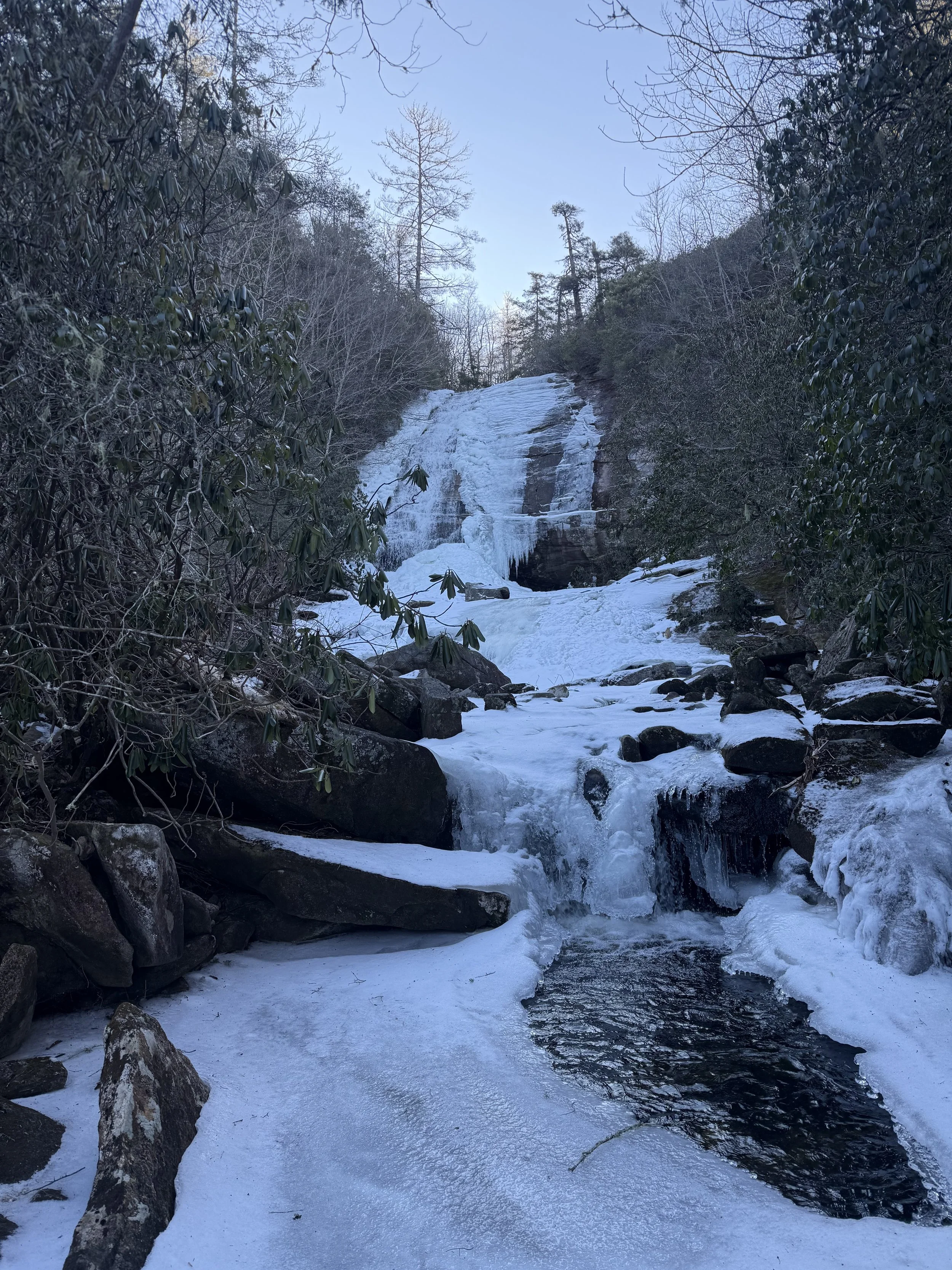 Much of the rest of the day went as it had begun, only with a few friends along the way. Local guide service owner and operator, James Perkins, joined for a half-marathon’s worth of the steepest and iciest portion of the whole day, and, despite the ankle rolling, the clinging to cliff face rhododendrons, and an unfortunate missed turn hidden behind frozen shrubbery, we made great work out of scampering along frozen waterfalls and granitic domes. We even got to experience Schoolhouse Falls in all its frozen glory, something which I had only done once despite spending most of my life in this region.